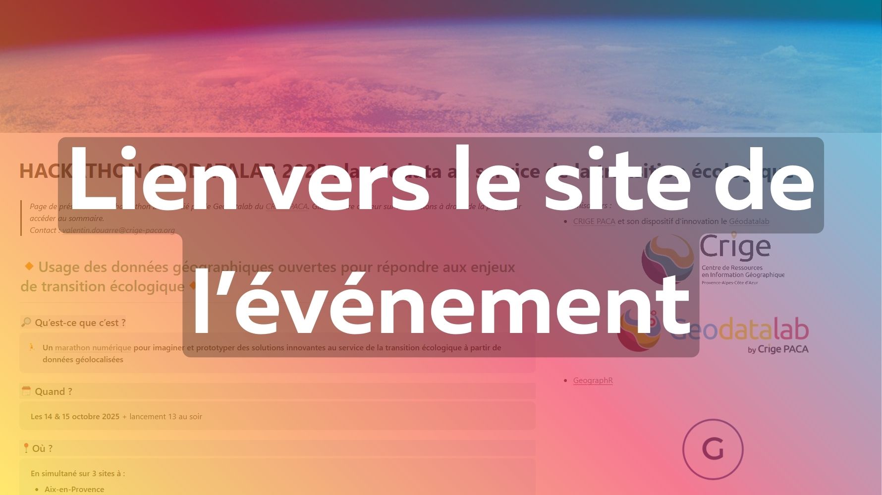 Le Geodatalab du CRIGE PACA, GeographR et leurs partenaires organisent un hackathon inter-université portant sur l’usage des données géographiques pour répondre aux enjeux de la transition écologique les 14 et 15 octobre 2025.